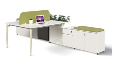 Cụm bàn nhân viên 2 chỗ ngồi chân ống chỏm cầu tóp côn sơn đen sần hoặc kem. Có 1 tủ phụ sâu 400mm và mặt ngồi mút dày 5cm bọc vải, có hộp giá gỗ đựng cây trang trí trên mặt tủ phụ. Mặt bàn gỗ MFC dày 25mm chống xước, chống cong vênh, mối mọt.