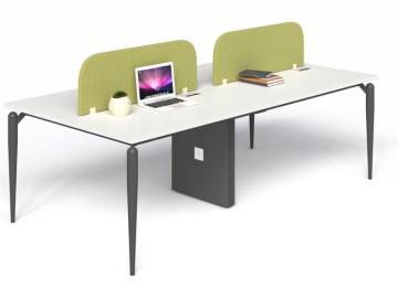Bàn nhân viên cụm 4 có hộp kỹ thuật ốp gỗ, chân sắt ống chỏm cầu tóp côn sơn đen sần hoặc kem, thanh giằng hộp 25x50.  Mặt bàn gỗ MFC dày 25mm chống xước, chống cong vênh, mối mọt. Bền bỉ theo thời gian.