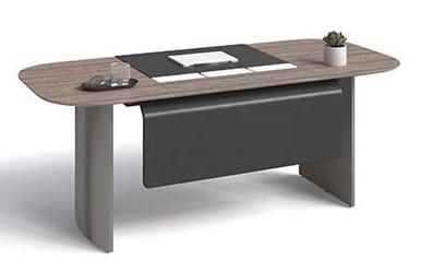 Bàn lãnh đạo, mặt bàn gỗ MFC 2 lớp, lớp trên dày 17mm cạnh vát chéo có ghép tấm da ở giữa, lớp dưới dày 25mm. Chân làm từ inox tấm mờ màu ghi dập ép tạo hình chỏm cầu. Yếm bàn làm từ khung sắt bọc da. Có máng điện và ổ điện.