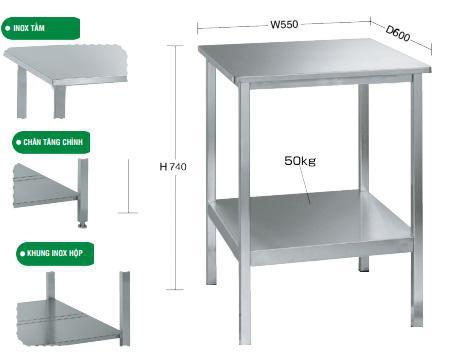 Bàn thao tác cố định 2 sàn inox Mai đến BTT1000-600CD-2T - Toàn bộ khung bằng Inox SUS 201 - Khung hộp 40x40x1,2mm - Mặt bàn bằng inox tấm dày 1,2mm - Chân tăng chỉnh 3-5mm - Khung hàn cố định - Tải trọng 100kg trên sàn